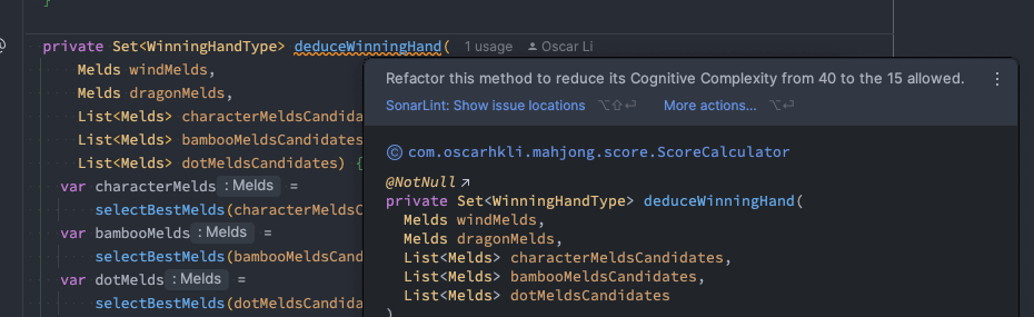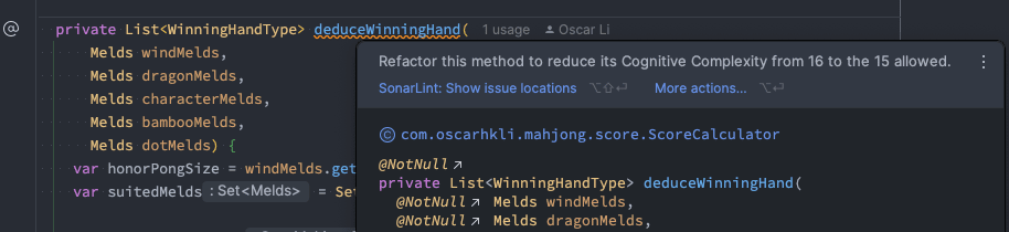 As an Agile practitioner, Testing-Driven Development (TDD) was naturally one of my techiques for developing the application. I continuously added test cases (Red), implemented the smallest possible piece of code to pass the tests (Green), and made a slight refactoring afterward (Blue). The diverse winning conditions inevitably led to a situation: if, for and while statements were scattered everywhere. Eventually, the cognitive complexity reached 40, exceeding SonarQube’s recommended limit of 15.