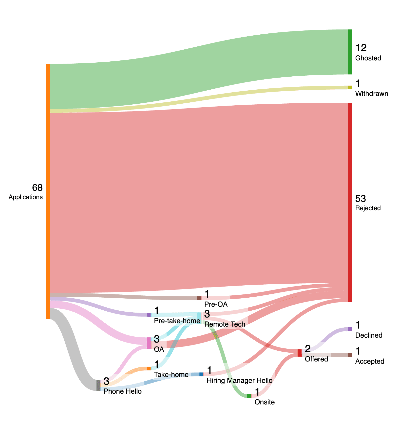 Most of my 68 applications were either rejected or ghosted at the first stage. Only a handful progressed to the next step.