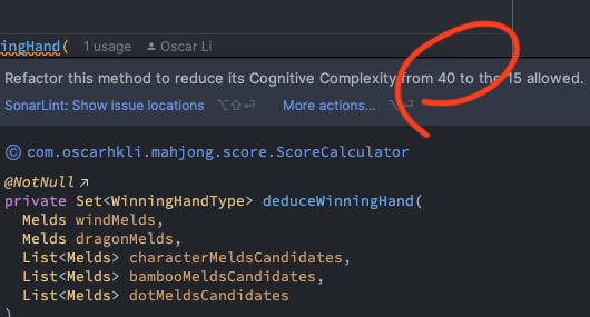 Cognitive complexity measures how difficult it is to understand a piece of code. The more conditional statements and nesting loops present, the higher the cognitive complexity is penalised.